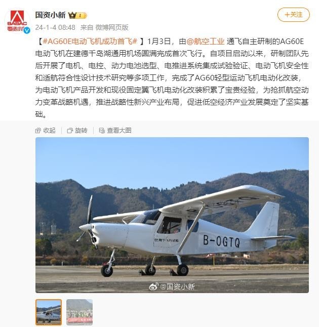 央視網(wǎng)消息:據(jù)@國資小新 消息,1月3日,由@航空工業(yè) 通飛自主研制的AG60E電動(dòng)飛機(jī)在建德千島湖通用機(jī)場圓滿完成首次飛行。自項(xiàng)目啟動(dòng)以來,研制團(tuán)隊(duì)先后開展了電機(jī)、電控、動(dòng)力電池選型、電推進(jìn)系統(tǒng)集成試驗(yàn)驗(yàn)證、電動(dòng)飛機(jī)安全性和適航符合性設(shè)計(jì)技術(shù)研究等多項(xiàng)工作,完成了AG60輕型運(yùn)動(dòng)飛機(jī)電動(dòng)化改裝,為電動(dòng)飛機(jī)產(chǎn)品開發(fā)和現(xiàn)役固定翼飛機(jī)電動(dòng)化改裝積累了寶貴經(jīng)驗(yàn),為搶抓航空動(dòng)力變革戰(zhàn)略機(jī)遇,推進(jìn)戰(zhàn)略性新興產(chǎn)業(yè)布局,促進(jìn)低空經(jīng)濟(jì)產(chǎn)業(yè)發(fā)展奠定了堅(jiān)實(shí)基礎(chǔ)。