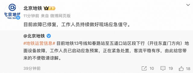 央視網(wǎng)消息:據(jù)@北京地鐵 微博最新消息,地鐵13號(hào)線知春路站至五道口站區(qū)段下行(開往東直門方向)地面設(shè)備故障已修復(fù),工作人員持續(xù)做好現(xiàn)場(chǎng)應(yīng)急值守。