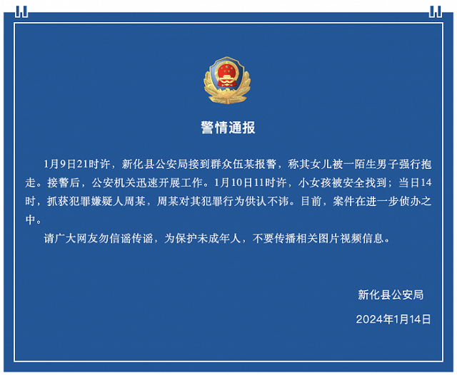 央視網(wǎng)消息:據(jù)“新化公安”公眾號消息,湖南新化縣公安局1月14日晚發(fā)布警情通報,1月9日21時許,新化縣公安局接到群眾伍某報警,稱其女兒被一陌生男子強(qiáng)行抱走。接警后,公安機(jī)關(guān)迅速開展工作。1月10日11時許,小女孩被安全找到;當(dāng)日14時,抓獲犯罪嫌疑人周某,周某對其犯罪行為供認(rèn)不諱。目前,案件在進(jìn)一步偵辦之中。