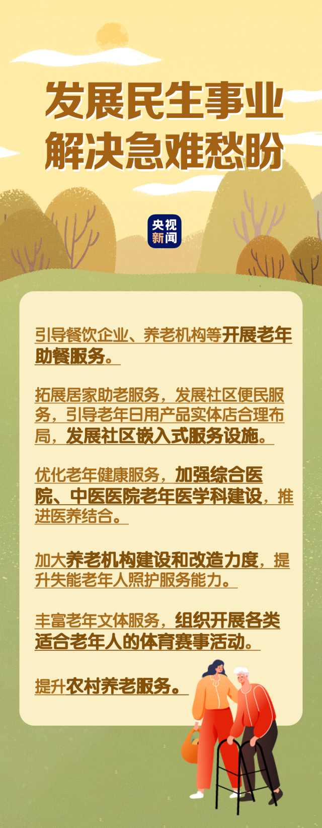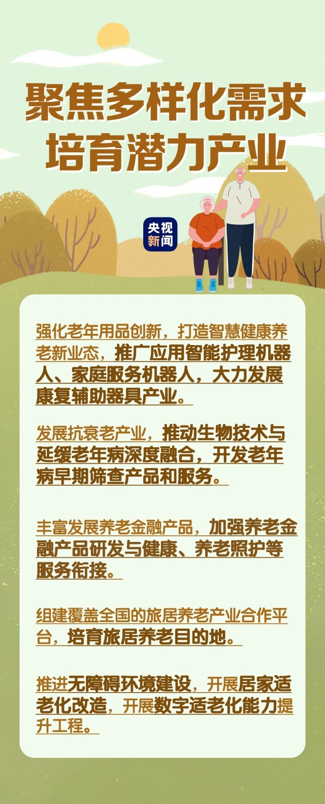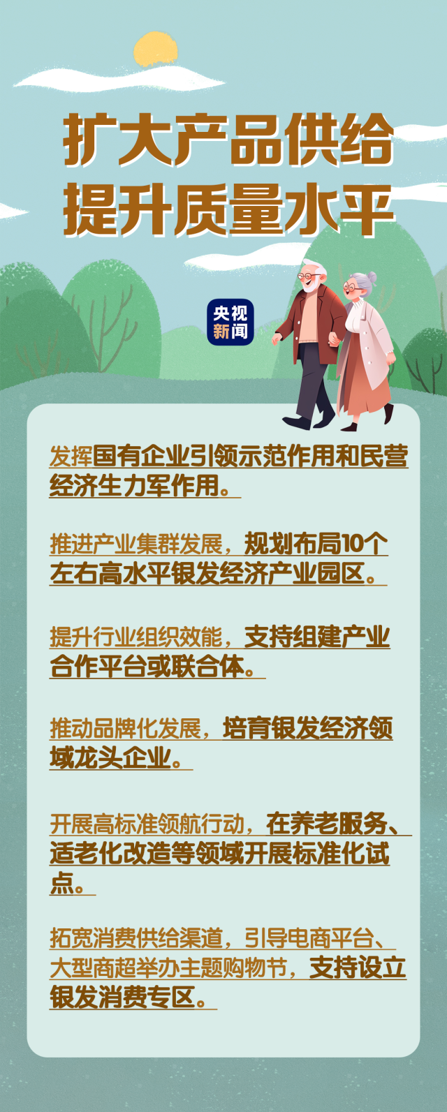 在民生事業(yè)方面,國(guó)家將擴(kuò)大和發(fā)展七方面的服務(wù),包括養(yǎng)老助餐、居家助老、社區(qū)便民、老年健康、養(yǎng)老照護(hù)、老年文體、農(nóng)村養(yǎng)老等方面的服務(wù)。國(guó)務(wù)院辦公廳印發(fā)《關(guān)于發(fā)展銀發(fā)經(jīng)濟(jì)增進(jìn)老年人福祉的意見》中提出了4個(gè)方面舉措,小編根據(jù)文件內(nèi)容進(jìn)行了簡(jiǎn)要梳理,一圖了解“銀發(fā)經(jīng)濟(jì)”核心要點(diǎn)。↓↓↓
