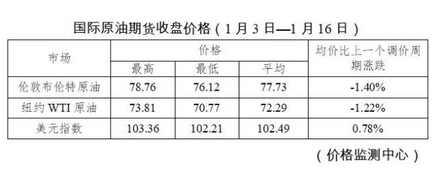 據國家發(fā)展改革委價格監(jiān)測中心監(jiān)測,本輪成品油調價周期內(1月3日-1月16日)國際油價在震蕩中小幅下降。平均來看,倫敦布倫特、紐約WTI油價比上輪調價周期下跌1.31%。