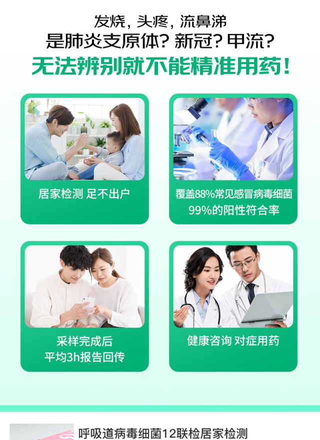 “99.99%陽性符合率,靈敏度比抗原高100到1000倍”……前不久,同樣發(fā)燒的王女士聽朋友推薦了一種可以上門做的呼吸道病毒細(xì)菌核酸檢測,“說是一次能查12種,比醫(yī)院的都全,價錢也不貴,首單69.9元。”