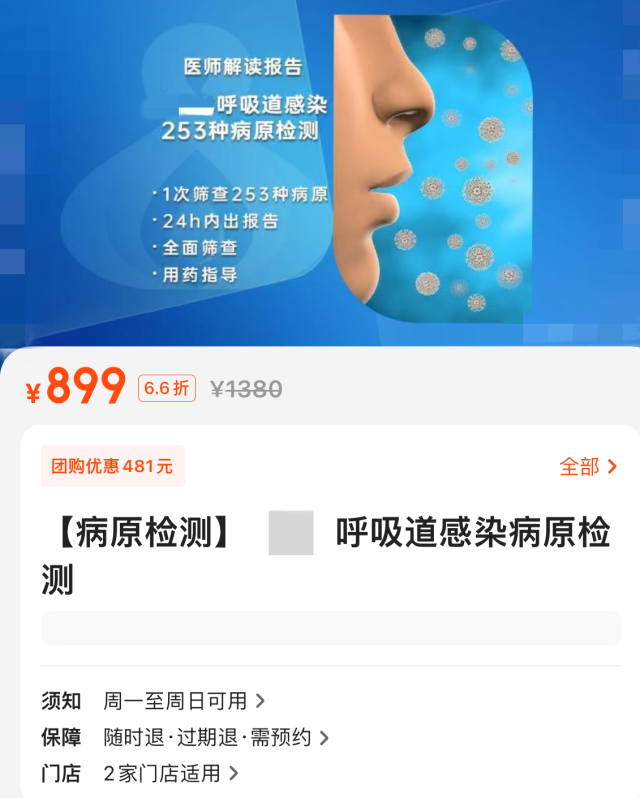 事實上,這并非種類最多的檢測方案。記者在調(diào)查中發(fā)現(xiàn),有機構(gòu)推出的呼吸道感染病原檢測一次篩查病原多達(dá)253種,原價1380元,折后也要899元。