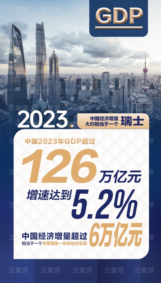 2023年中國(guó)經(jīng)濟(jì)年報(bào)顯示,全年GDP超過(guò)126萬(wàn)億元(人民幣,下同),增速達(dá)到5.2%。按照可比價(jià)計(jì)算,2023年中國(guó)經(jīng)濟(jì)增量超過(guò)6萬(wàn)億元,相當(dāng)于一個(gè)中等國(guó)家一年的經(jīng)濟(jì)總量。
