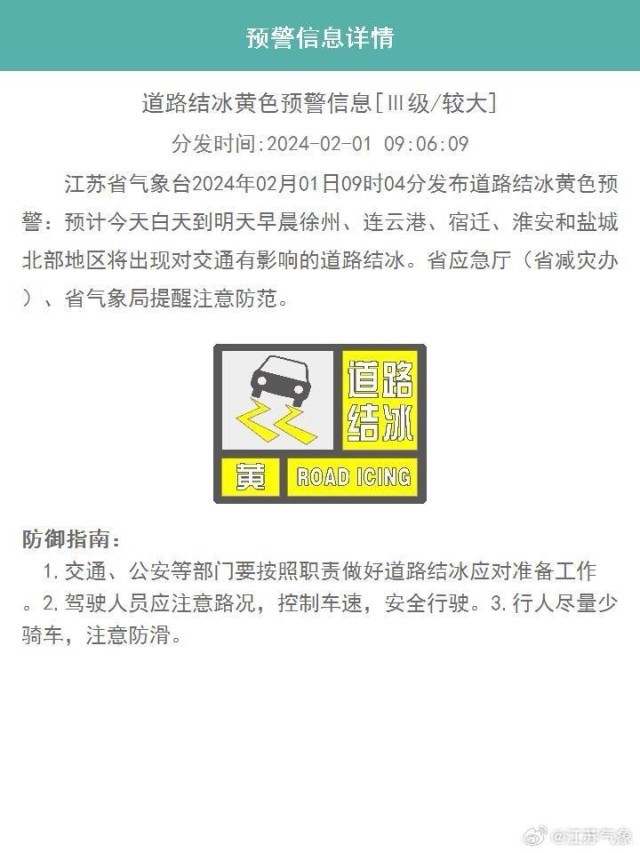 2月1日9時04分,江蘇省氣象臺發(fā)布道路結(jié)冰黃色預(yù)警: 預(yù)計今天白天到明天早晨,徐州、連云港、宿遷、淮安和鹽城北部地區(qū)將出現(xiàn)對交通有影響的道路結(jié)冰。江蘇省應(yīng)急廳(省減災(zāi)辦)、省氣象局提醒注意防范。