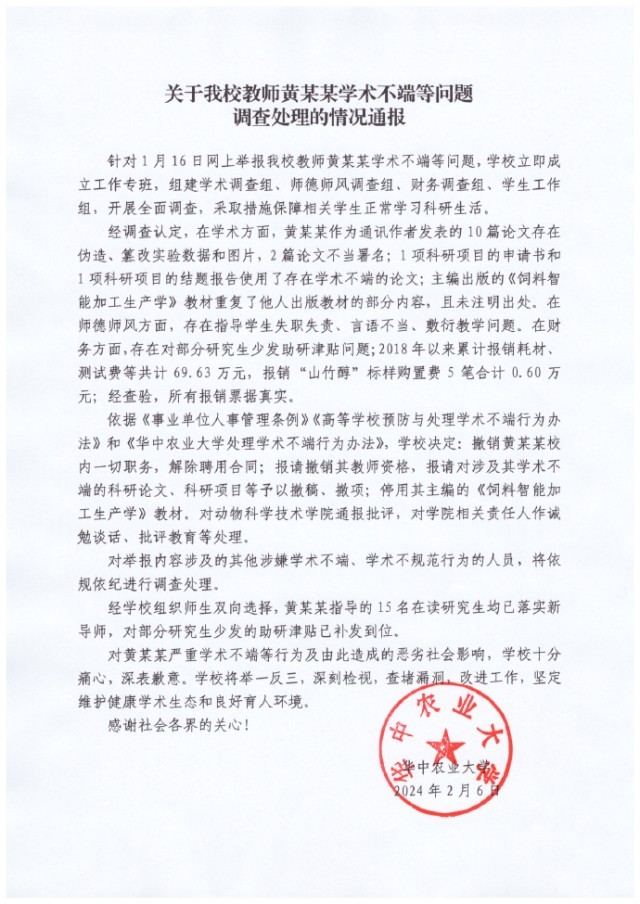 央視網(wǎng)消息:2月6日,華中農(nóng)業(yè)大學(xué)通報教師黃某某學(xué)術(shù)不端等問題調(diào)查處理情況。具體如下: