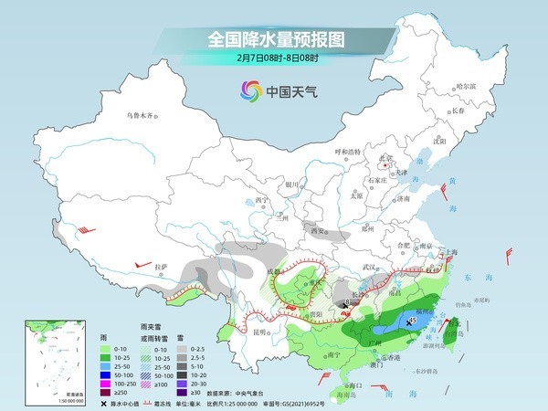 今天(2月7日)南方大范圍雨雪天氣持續(xù),湖南中南部、江西西南部等地部分地區(qū)有大雪,局地暴雪;貴州中部和東部、湖南中南部以及江西西北部山區(qū)、浙江中南部山區(qū)等地部分地區(qū)有凍雨。明天,南方雨雪將開始減弱,到除夕全國大部地區(qū)都將迎來晴朗天氣。同時,隨著雨雪消退,持續(xù)多日的南方濕冷天氣也將在春節(jié)假期間迎來轉折。