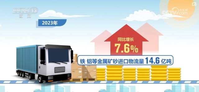 2023年,進口物流總額18.0萬億元,同比增長13.0%,進口物流量保持快速恢復態(tài)勢。原油、天然氣、煤炭等能源產(chǎn)品進口物流量11.6億噸,同比增長27.2%,鐵、鋁等金屬礦砂進口物流量14.6億噸,同比增長7.6%。