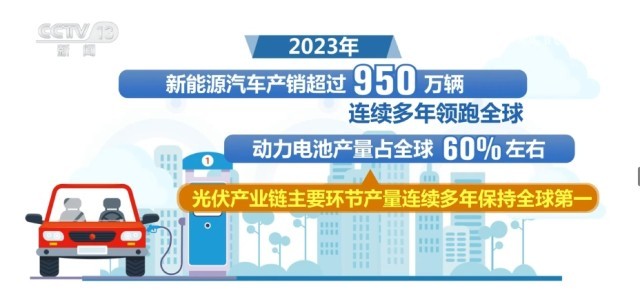 2023年,我國(guó)高技術(shù)制造業(yè)、裝備制造業(yè)增加值占規(guī)模以上工業(yè)增加值比重分別達(dá)到15.7%和33.6%。新能源汽車產(chǎn)銷超過(guò)950萬(wàn)輛,連續(xù)多年領(lǐng)跑全球,動(dòng)力電池產(chǎn)量占全球60%左右,光伏產(chǎn)業(yè)鏈主要環(huán)節(jié)產(chǎn)量連續(xù)多年保持全球第一。