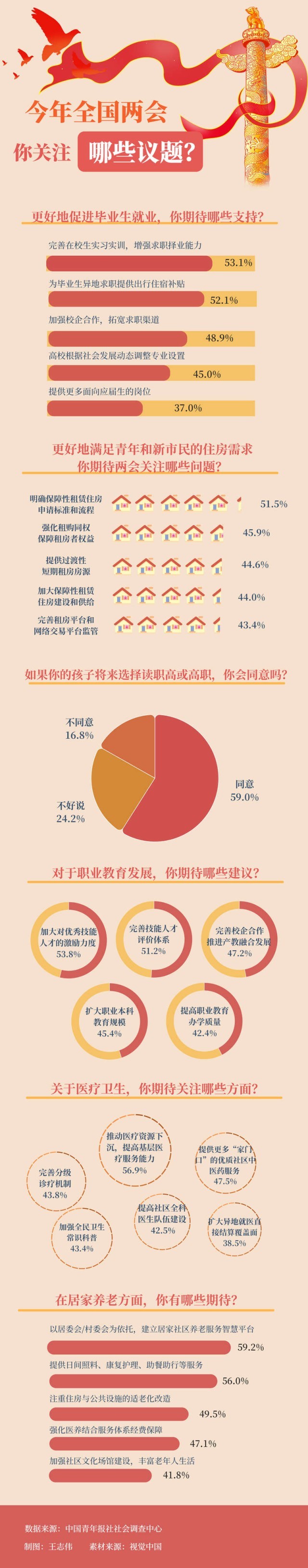 全國兩會(huì)時(shí)間開啟,哪些議題牽動(dòng)著大家的心?全國兩會(huì)前夕,中青報(bào)社調(diào)中心進(jìn)行的一項(xiàng)調(diào)查顯示,就業(yè)、教育、醫(yī)療、住房等民生議題頗受關(guān)注。今年全國兩會(huì),你關(guān)注哪些議題?