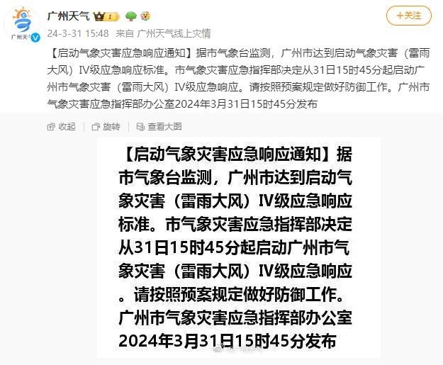 央視網(wǎng)消息:據(jù)廣州天氣 消息,據(jù)廣州市氣象臺監(jiān)測,廣州市達到啟動氣象災(zāi)害(雷雨大風(fēng))Ⅳ級應(yīng)急響應(yīng)標(biāo)準。市氣象災(zāi)害應(yīng)急指揮部決定從31日15時45分起啟動廣州市氣象災(zāi)害(雷雨大風(fēng))Ⅳ級應(yīng)急響應(yīng)。請按照預(yù)案規(guī)定做好防御工作。
