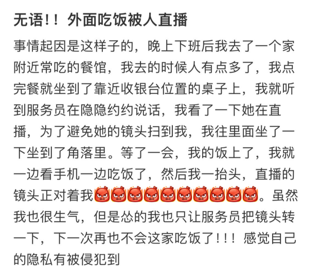 據(jù)媒體報(bào)道,近期,陜西西安兩名老人用餐時(shí)被商家拍下視頻,之后商家又私自將拍攝內(nèi)容發(fā)到網(wǎng)上,老人親戚無意刷到視頻才發(fā)現(xiàn)。在老人家屬與其多次溝通后,商家刪除了視頻。消費(fèi)者多在不知情或者未被征詢意見的情況下被動(dòng)充當(dāng)商家直播或者拍攝短視頻的引流工具,除了自己的言行舉止可能被迫接受他人的凝視和審判外,還有面部信息泄露風(fēng)險(xiǎn)。