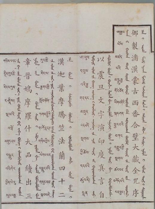 康熙皇帝特別注重刊行蒙古文《甘珠爾》以“利于祭誦”,康熙五十六年(1717年)下令刊刻蒙古文《甘珠爾》。到了乾隆三十二年(1767年),傅恒上書提出,要讓僧人念經(jīng)念得準(zhǔn),需要標(biāo)明原音、輔音的韻腳和切音,最好能看著漢字就能念出梵音(“禮今教習(xí)僧人持念咒語止,須明曉阿禮嘎禮音韻反切,自能對(duì)漢字而得梵音”)。于是,為方便蒙古地區(qū)僧人念誦咒語,《御制滿漢西番合璧大藏全咒》添譯了蒙古文。蒙古文《大藏經(jīng)》是蒙古族歷史文化發(fā)展的里程碑,也是蒙古族已知最大部頭的古籍。在譯經(jīng)過程中,蒙古文字也得到了充分錘煉與發(fā)展,提高了交流與表現(xiàn)能力。
