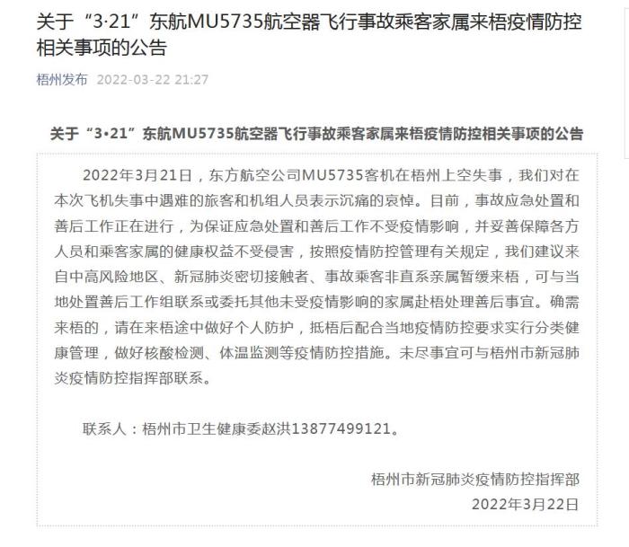 中新網(wǎng)3月22日電 據(jù)“梧州發(fā)布”微信公眾號消息,3月22日,梧州市新冠肺炎疫情防控指揮部發(fā)布通告稱,2022年3月21日,東方航空公司MU5735客機在梧州上空失事。目前,事故應(yīng)急處置和善后工作正在進行,為保證應(yīng)急處置和善后工作不受疫情影響,并妥善保障各方人員和乘客家屬的健康權(quán)益不受侵害,按照疫情防控管理有關(guān)規(guī)定,我們建議來自中高風(fēng)險地區(qū)、新冠肺炎密切接觸者、事故乘客非直系親屬暫緩來梧,可與當?shù)靥幹蒙坪蠊ぷ鹘M聯(lián)系或委托其他未受疫情影響的家屬赴梧處理善后事宜。