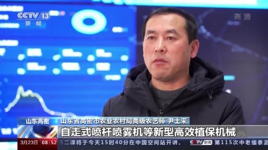 山東省高密市農(nóng)業(yè)農(nóng)村局高級農(nóng)藝師 尹士采:我們利用植保無人機、自走式噴桿噴霧機等新型高效植保機械,開展小麥病蟲草害統(tǒng)防統(tǒng)治,同時加強對農(nóng)戶、家庭農(nóng)場的指導(dǎo)服務(wù)。