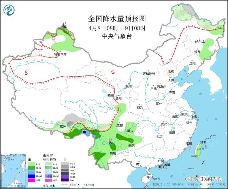 4月8日08時至9日08時,新疆北疆北部、西藏東部、內蒙古東北部、黑龍江北部等地的部分地區(qū)有小到中雪或夾雪,其中新疆北疆北部等地的部分地區(qū)有大雪,局地暴雨(10~15毫米);新疆北部、西藏東南部、黑龍江東部、吉林東部、甘肅南部、四川南部、重慶西部、貴州、云南等地的部分地區(qū)有小到中雨,其中云南北部、西藏東南部局地有大雨或暴雨(50~60毫米)。甘肅中西部、西北地區(qū)東北部、內蒙古大部、東北地區(qū)中南部、山東半島、西藏中南部等地的部分地區(qū)有4~6級風(見圖3)。