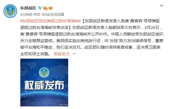 東部戰(zhàn)區(qū)回應(yīng)美艦過(guò)航臺(tái)灣海峽:全程跟監(jiān)警戒