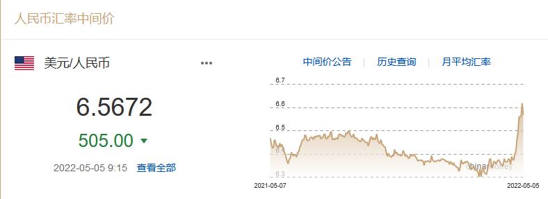 5月5日人民幣對美元匯率中間價較上日上調(diào)505點(diǎn)