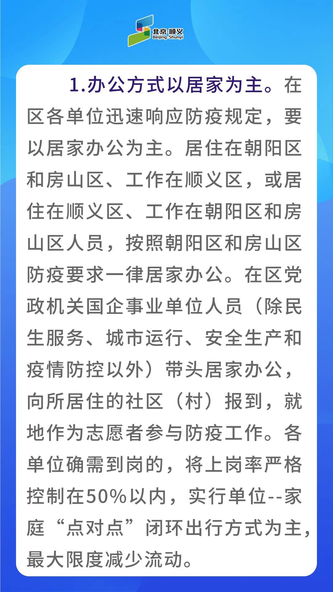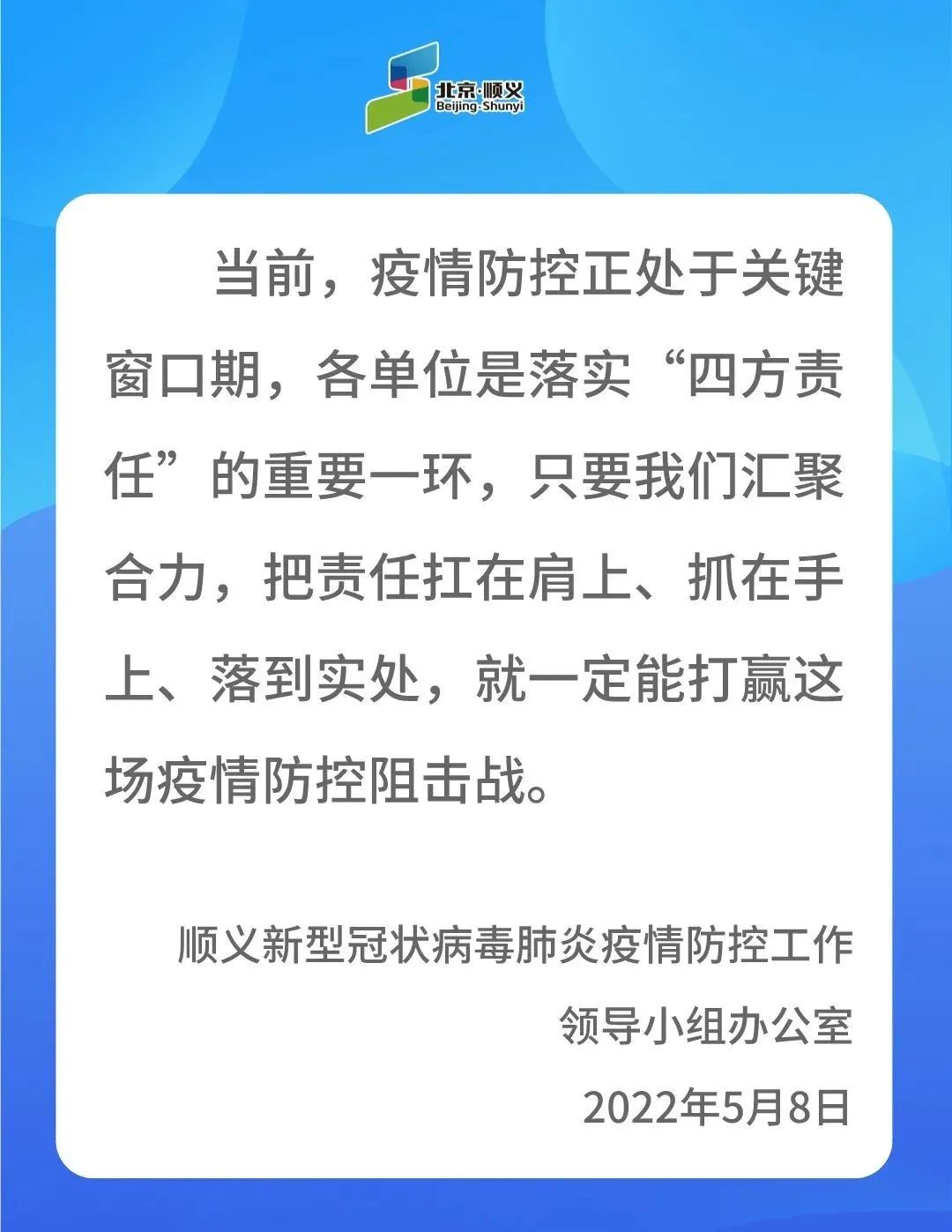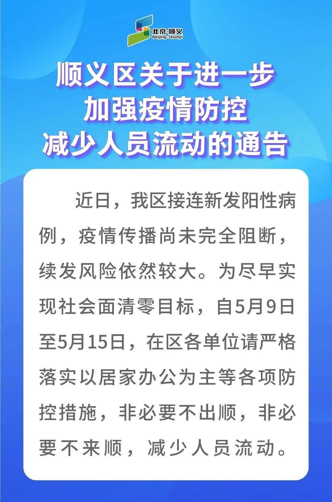 中新網(wǎng)5月8日電 據(jù)“北京順義”微信公眾號消息,5月8日,順義區(qū)發(fā)布《順義區(qū)關(guān)于進一步加強疫情防控減少人員流動的通告》指出,為盡早實現(xiàn)社會面清零目標(biāo),自5月9日至5月15日,在區(qū)各單位請嚴(yán)格落實以居家辦公為主等各項防控措施,非必要不出順,非必要不來順,減少人員流動。