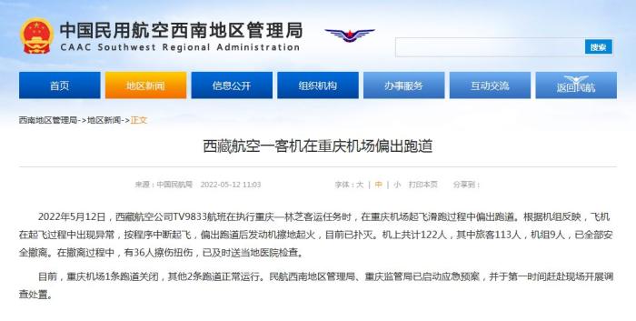 中新網(wǎng)5月12日電 據(jù)民航局網(wǎng)站消息,民航局今日就西藏航空一客機(jī)在重慶機(jī)場偏出跑道發(fā)布通報(bào)。通報(bào)稱,2022年5月12日,西藏航空公司TV9833航班在執(zhí)行重慶—林芝客運(yùn)任務(wù)時(shí),在重慶機(jī)場起飛滑跑過程中偏出跑道。根據(jù)機(jī)組反映,飛機(jī)在起飛過程中出現(xiàn)異常,按程序中斷起飛,偏出跑道后發(fā)動(dòng)機(jī)擦地起火,目前已撲滅。機(jī)上共計(jì)122人,其中旅客113人,機(jī)組9人,已全部安全撤離。在撤離過程中,有36人擦傷扭傷,已及時(shí)送當(dāng)?shù)蒯t(yī)院檢查。