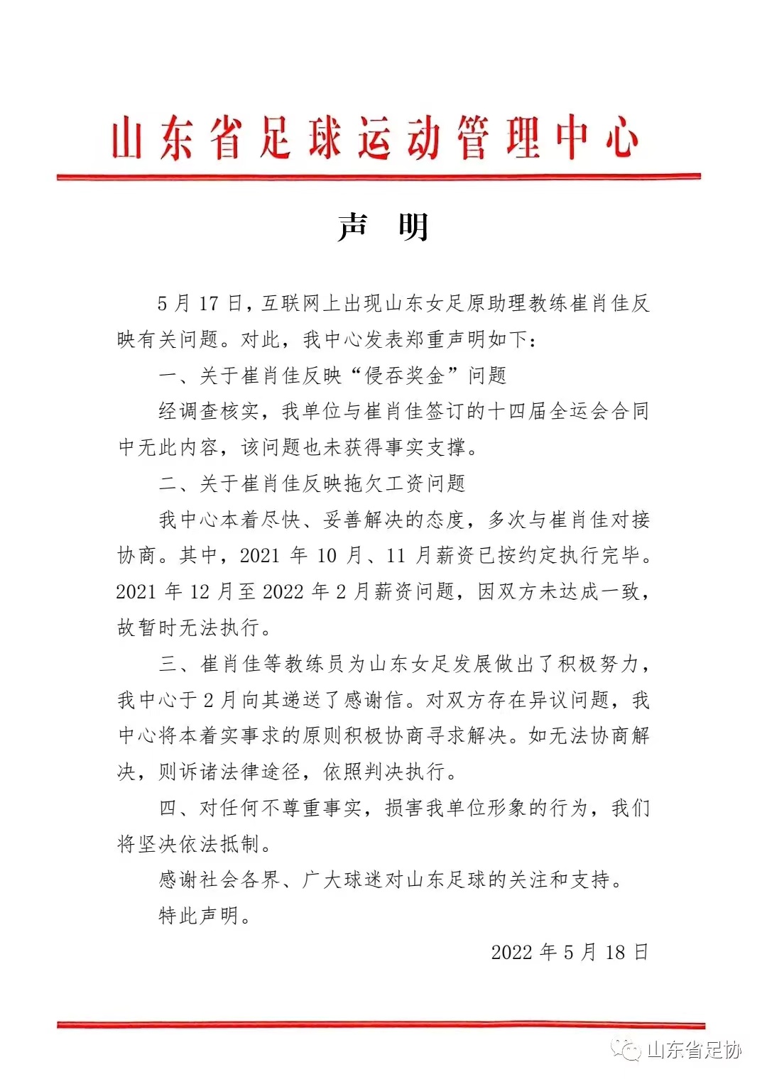 5月17日,互聯(lián)網(wǎng)上出現(xiàn)山東女足原助理教練崔肖佳反映有關(guān)問(wèn)題。對(duì)此,我中心發(fā)表鄭重聲明如下: