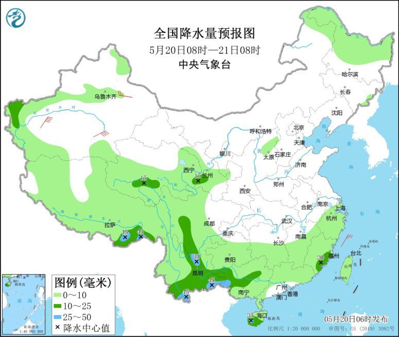 5月20日8時(shí)至21日8時(shí),西藏北部、青海南部的部分地區(qū)有小到中雪或雨夾雪;云南中東部和南部、四川南部、廣西西部和中部、福建東部、海南島等地的部分地區(qū)有中雨,局地大雨(25~45毫米)。新疆南疆盆地等地的部分地區(qū)有4~6級(jí)風(fēng)。