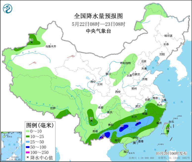 5月22日8時(shí)至23日8時(shí),新疆伊犁河谷、四川南部、云南南部、貴州南部、湖南中南部、江西大部、浙江南部、廣西大部、廣東中北部、福建大部等地部分地區(qū)有中到大雨,其中,云南東南部、廣西西北部和東北部等地部分地區(qū)有暴雨或大暴雨(100~110毫米)。新疆南疆盆地和東部等地部分地區(qū)有4~6級(jí)風(fēng)。