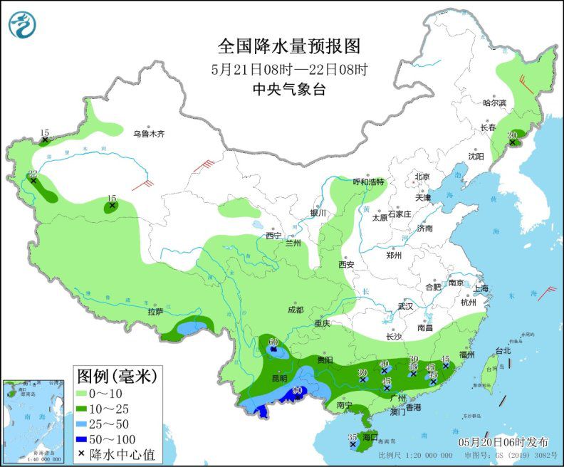 全國(guó)降水量預(yù)報(bào)圖(5月20日8時(shí)-21日8時(shí))