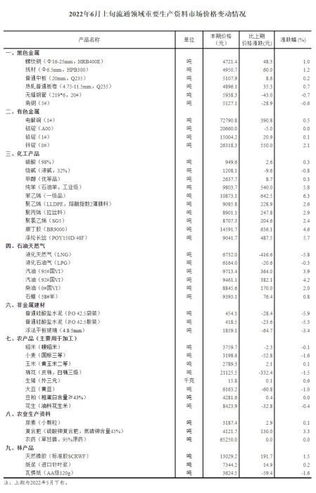 2022年6月上旬流通領域重要生產資料市場價格變動情況。國家統(tǒng)計局網站截圖
