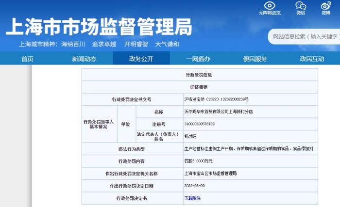 中新財(cái)經(jīng)6月20日電 上海市市場監(jiān)督管理局網(wǎng)站消息,近日,沃爾瑪華東百貨有限公司上海顧村分店,因售賣過期悅鮮活牛奶,被上海市寶山區(qū)市場監(jiān)督管理局罰款3萬元。