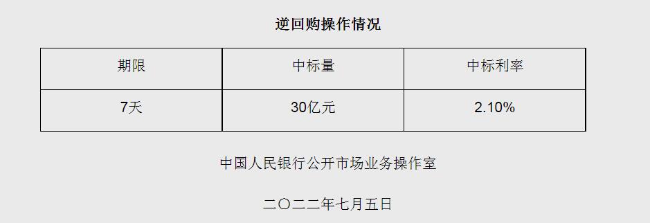 央行7月5日開展30億元逆回購操作 中標利率2.10%