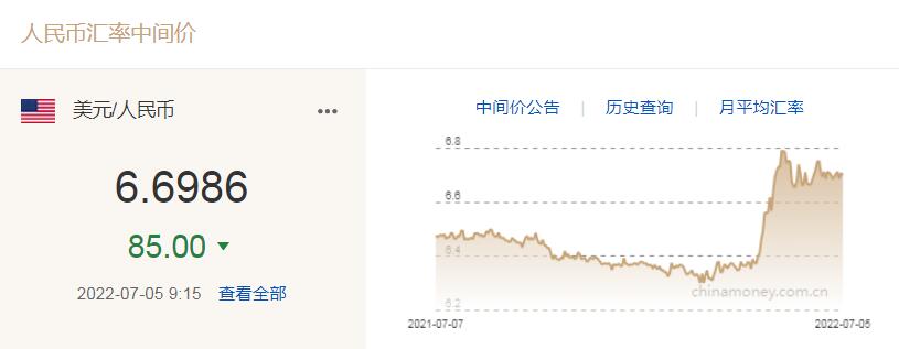 中新網(wǎng)7月5日電 中國(guó)人民銀行授權(quán)公布,2022年7月5日銀行間外匯市場(chǎng)人民幣匯率中間價(jià)為1美元對(duì)人民幣6.6986元。這較上一交易日上調(diào)85個(gè)基點(diǎn)。(中新財(cái)經(jīng))