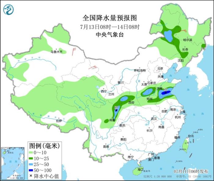 7月13日08時至14日08時,甘肅東南部、陜西關(guān)中地區(qū)、內(nèi)蒙古東北部、吉林西部、遼寧北部、山西南部、河北南部、河南北部和東部、山東中南部、蘇皖北部及四川盆地西北部等地的部分地區(qū)有中到大雨,其中,山東南部、四川盆地西北部等地局部地區(qū)有暴雨(50~80毫米)。黑龍江西南部、新疆東部等地部分地區(qū)有4~6級風(fēng)。南海西南部海域?qū)⒂?~6級、陣風(fēng)7級的西南風(fēng)。