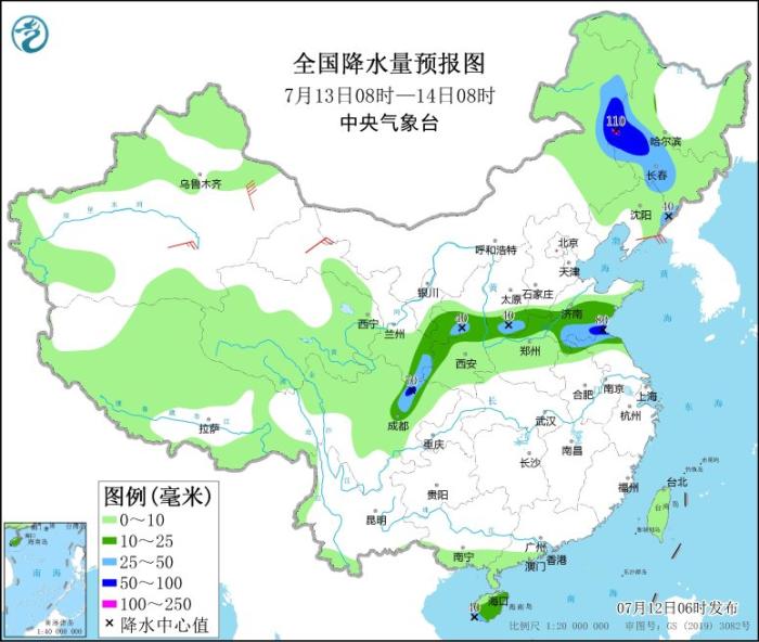 7月13日08時至14日08時,內(nèi)蒙古東部、黑龍江西南部、吉林、遼寧東北部、甘肅東南部、陜西中部和西南部、山西南部、河南北部、河北南部、山東中南部、四川盆地西北部、海南島等地部分地區(qū)有中到大雨,其中,內(nèi)蒙古東北部、黑龍江西南部、吉林西部、山東南部等地部分地區(qū)有暴雨或大暴雨(100~110毫米)。新疆南疆盆地、甘肅河西等地部分地區(qū)有4~6級風。
