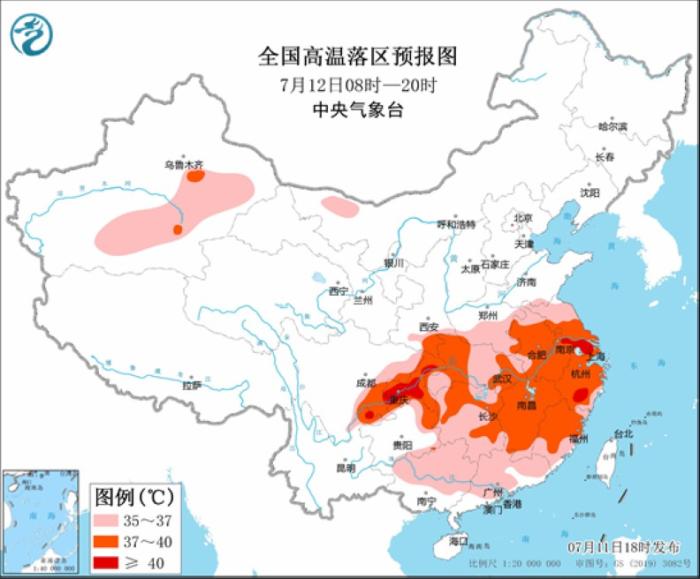 中央氣象臺7月12日06時繼續(xù)發(fā)布高溫橙色預警:預計7月12日白天,新疆南疆盆地、陜西南部、黃淮南部、西南地區(qū)東部、江漢、江淮、江南、華南等地有35℃以上高溫天氣,其中,安徽、江蘇中南部、上海、湖北西部和東南部、湖南北部和東部、江西、浙江、福建大部、四川盆地東南部、重慶、貴州東北部等地的部分地區(qū)最高氣溫37~39℃,江蘇南部、上海北部、浙江南部、四川盆地東南部、重慶中西部和北部局地可達40℃以上。