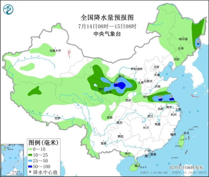 7月14日08時至15日08時,內(nèi)蒙古西部、西北地區(qū)東部、河南東部、山東南部、安徽北部、江蘇中北部、黑龍江東部、吉林東北部等地部分地區(qū)有中到大雨,其中,甘肅東部、寧夏中部、陜西北部、安徽北部、江蘇中部等地部分地區(qū)有暴雨(50~80毫米)。新疆東部部分地區(qū)有6~7級風。