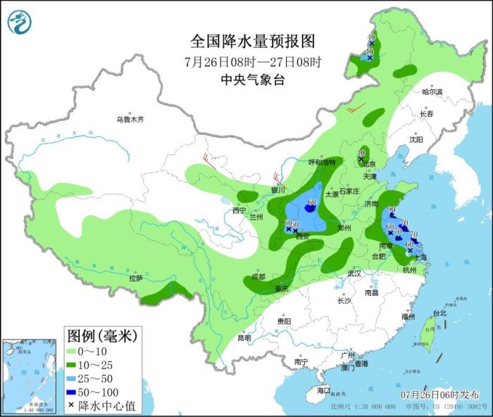 7月26日08時(shí)至27日08時(shí),內(nèi)蒙古東北部、西北地區(qū)東北部、華北北部和西部、黃淮東部、江淮東部、湖北西部、西南地區(qū)東北部等地部分地區(qū)有中到大雨,其中,陜西中北部、江蘇中北部等地局地有暴雨(50~90毫米)。內(nèi)蒙古中部、甘肅河西、寧夏北部等地部分地區(qū)有4~5級風(fēng)(見圖2)。
