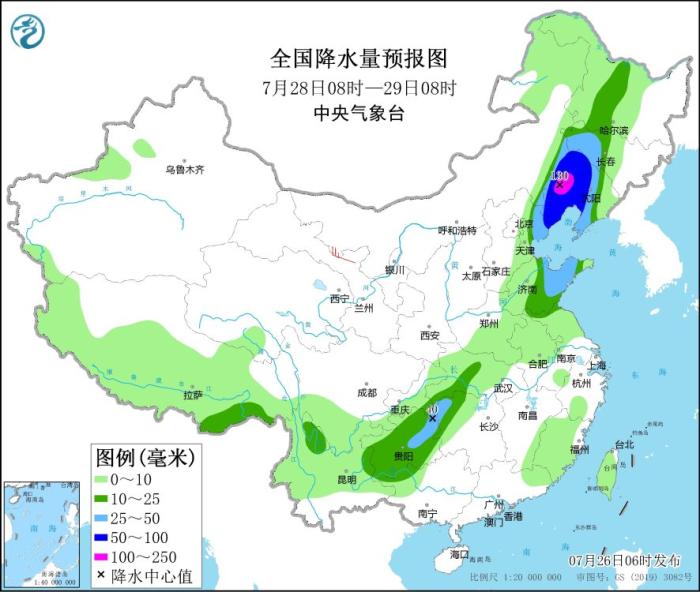 7月28日08時(shí)至29日08時(shí),內(nèi)蒙古東部、東北地區(qū)西部和南部、華北北部、黃淮東部、西南地區(qū)東南部等地部分地區(qū)有中到大雨,其中,內(nèi)蒙古東南部、遼寧中西部和北部等地部分地區(qū)有暴雨或大暴雨(100~130毫米)。甘肅河西部分地區(qū)有4~5級風(fēng)(見圖4)。
