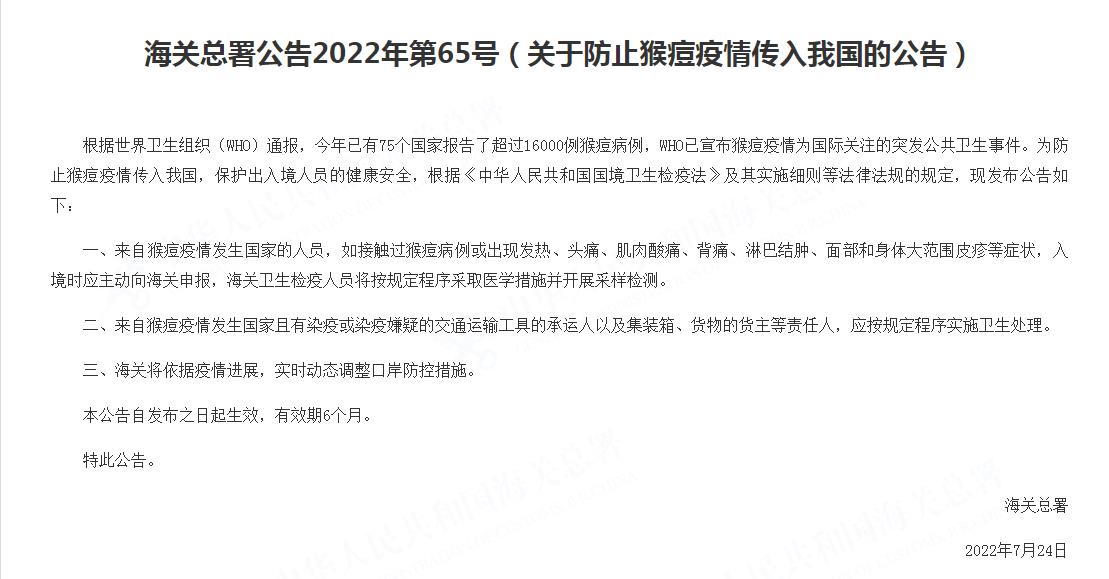 海關總署發(fā)布關于防止猴痘疫情傳入我國的公告