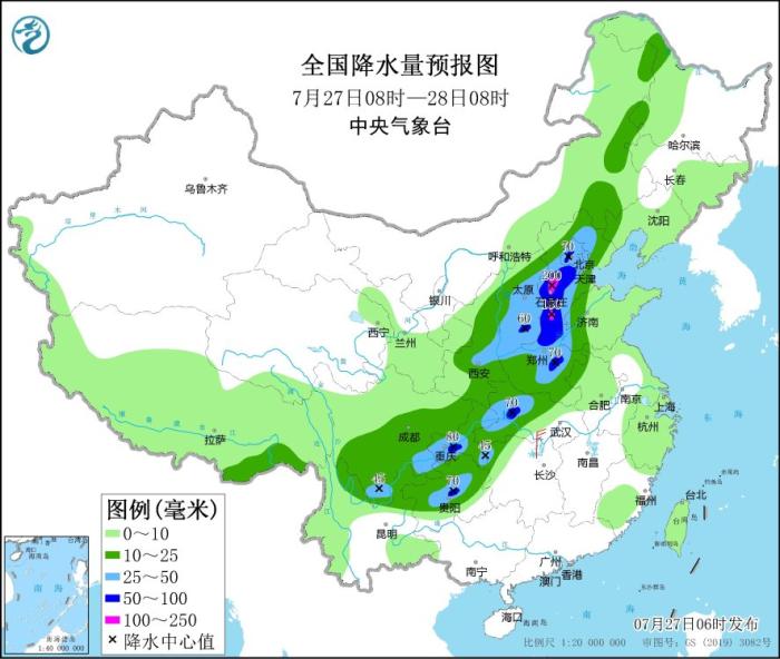 圖2 全國降水量預(yù)報圖(7月27日08時-28日08時)