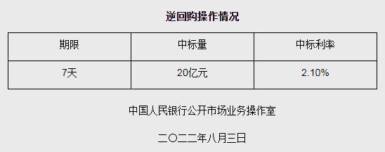 央行8月3日開展20億元逆回購(gòu)操作 中標(biāo)利率2.10%