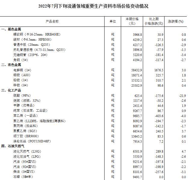中新網(wǎng)8月4日電 國家統(tǒng)計(jì)局4日公布2022年7月下旬流通領(lǐng)域重要生產(chǎn)資料市場價(jià)格變動(dòng)情況,據(jù)對全國流通領(lǐng)域9大類50種重要生產(chǎn)資料市場價(jià)格的監(jiān)測顯示,2022年7月下旬與7月中旬相比,15種產(chǎn)品價(jià)格上漲,32種下降,3種持平。