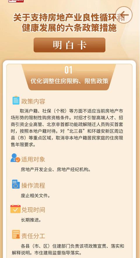 根據(jù)政策明白卡,廊坊優(yōu)化調(diào)整住房限購(gòu)、限售政策。取消戶籍、社保(個(gè)稅)等方面不適應(yīng)當(dāng)前房地產(chǎn)市場(chǎng)形勢(shì)的限制性購(gòu)房資格條件。對(duì)招才引智高端人才、招商引資企業(yè)高管、北京非首都功能疏解隨遷人員購(gòu)買首套時(shí),按照本地戶籍對(duì)待。對(duì)“北三縣”和環(huán)雄安新區(qū)周邊縣(市)等重點(diǎn)區(qū)域,取消非本地戶籍居民家庭的住房限售年限要求。