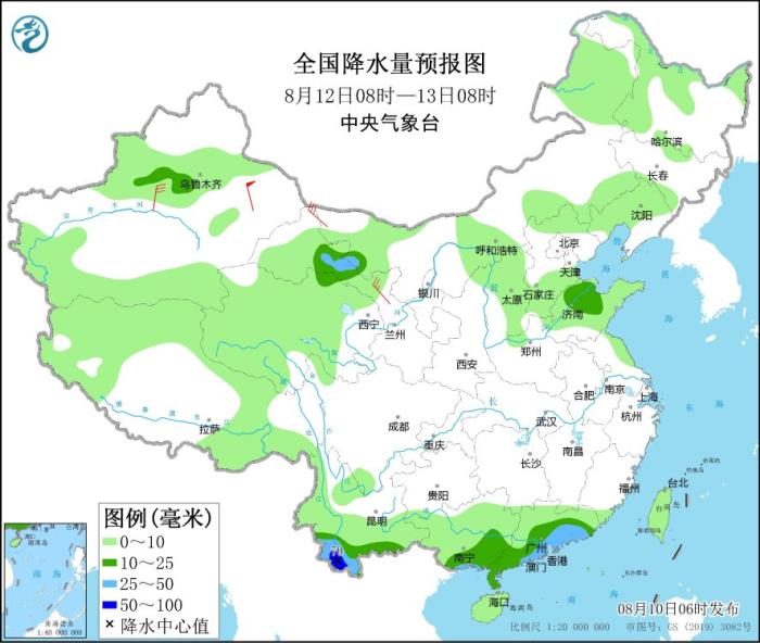 8月12日08時(shí)至13日08時(shí),新疆沿天山地區(qū)、甘肅西部、山東北部、廣東中南部、廣西南部、云南南部等地的部分地區(qū)有中到大雨,其中,云南西南部等地局地有暴雨(50~70毫米)。內(nèi)蒙古西北部、甘肅河西等地部分地區(qū)有4~6級(jí)風(fēng),其中,新疆東部部分地區(qū)有7~8級(jí)風(fēng)。