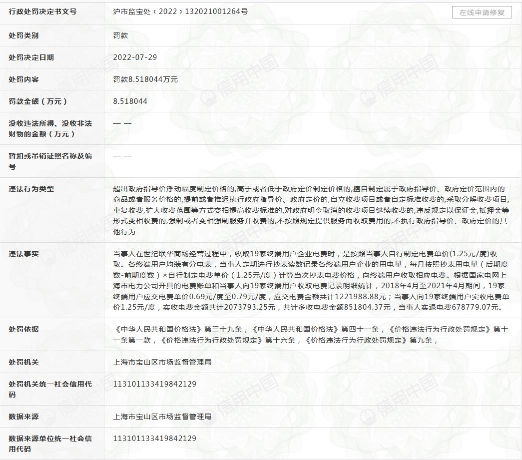世紀(jì)聯(lián)華加價(jià)收取電費(fèi)被罰8.5萬
