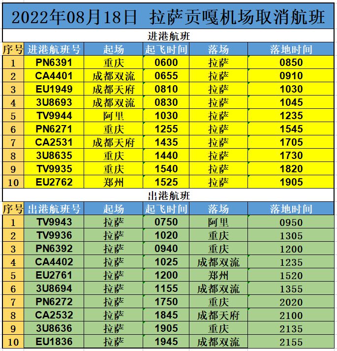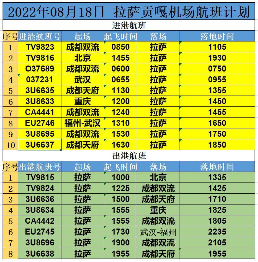 因公共安全原因,8月18日,拉薩貢嘎機場部分航班取消,計劃執(zhí)行進(jìn)出港航班18架次,分別為: