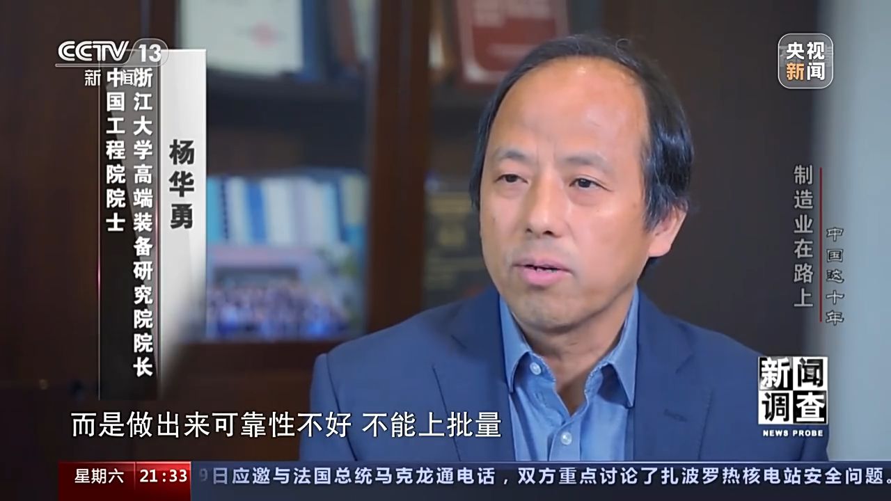中國工程院院士 浙江大學(xué)高端裝備研究院院長 楊華勇:大噸位的起重機(jī)、挖掘機(jī)大量進(jìn)口,咱們就沒有自己的,中國不是說做不出來,而是做出來可靠性不好,不能上批量。