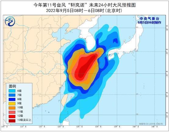 中央氣象臺消息,今年第11號臺風(fēng)“軒嵐諾”的中心今天(5日)早晨7點鐘位于距離浙江省朱家尖島偏東方向約245公里的東海南部海面上(北緯29.6度、東經(jīng)124.9度),中心附近最大風(fēng)力有16級(55米/秒),中心最低氣壓為930百帕,七級風(fēng)圈半徑350-400公里,十級風(fēng)圈半徑120-150公里,十二級風(fēng)圈半徑30公里。