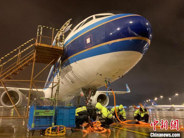 南航機(jī)務(wù)人員完成所有停場(chǎng)飛機(jī)前起落架與主起落架系留。 南航供圖