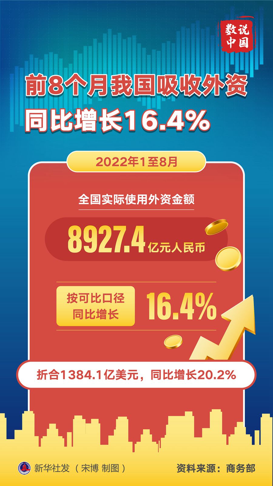 新華社北京9月19日電 (記者 謝?,?記者19日從商務(wù)部獲悉,2022年1至8月,全國實際使用外資金額8927.4億元人民幣,按可比口徑同比增長16.4%(下同),折合1384.1億美元,同比增長20.2%。